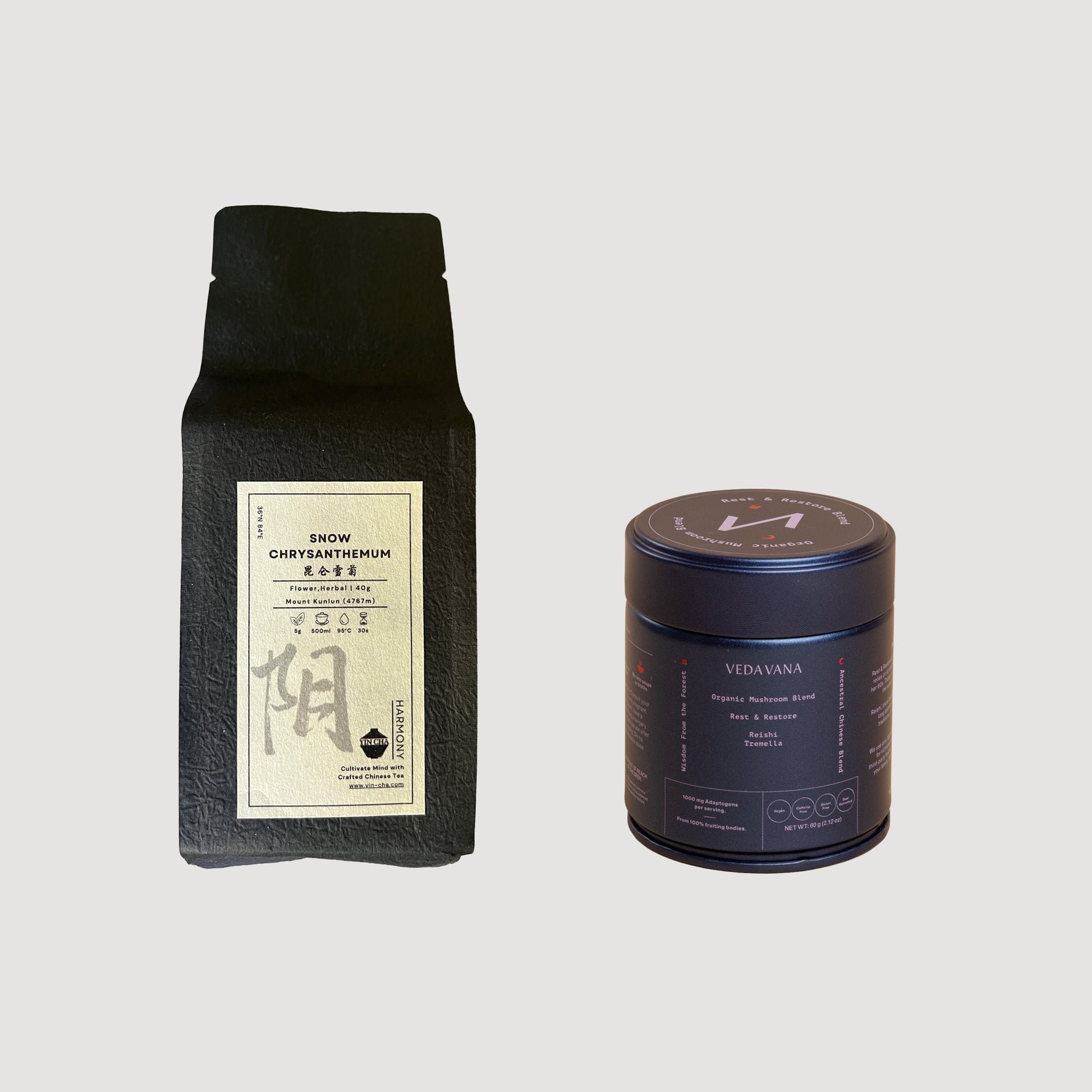 The Sweet Dreams Bundle pairs Reishi, known in Daoist tradition as the “mushroom of calm and balance,” with Snow Chrysanthemum, a rare mountain blossom cherished for its gentle floral warmth.
